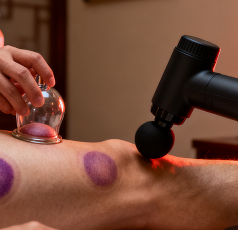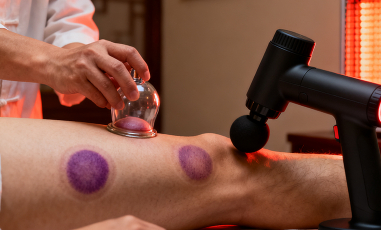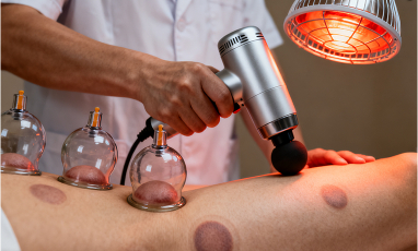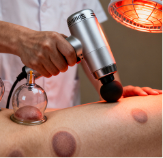 传承罐法配合筋膜枪、红外线烤灯,传承配方产品通过温和渗透方式作用于疼痛部位,不刺激皮肤,不损伤肌理