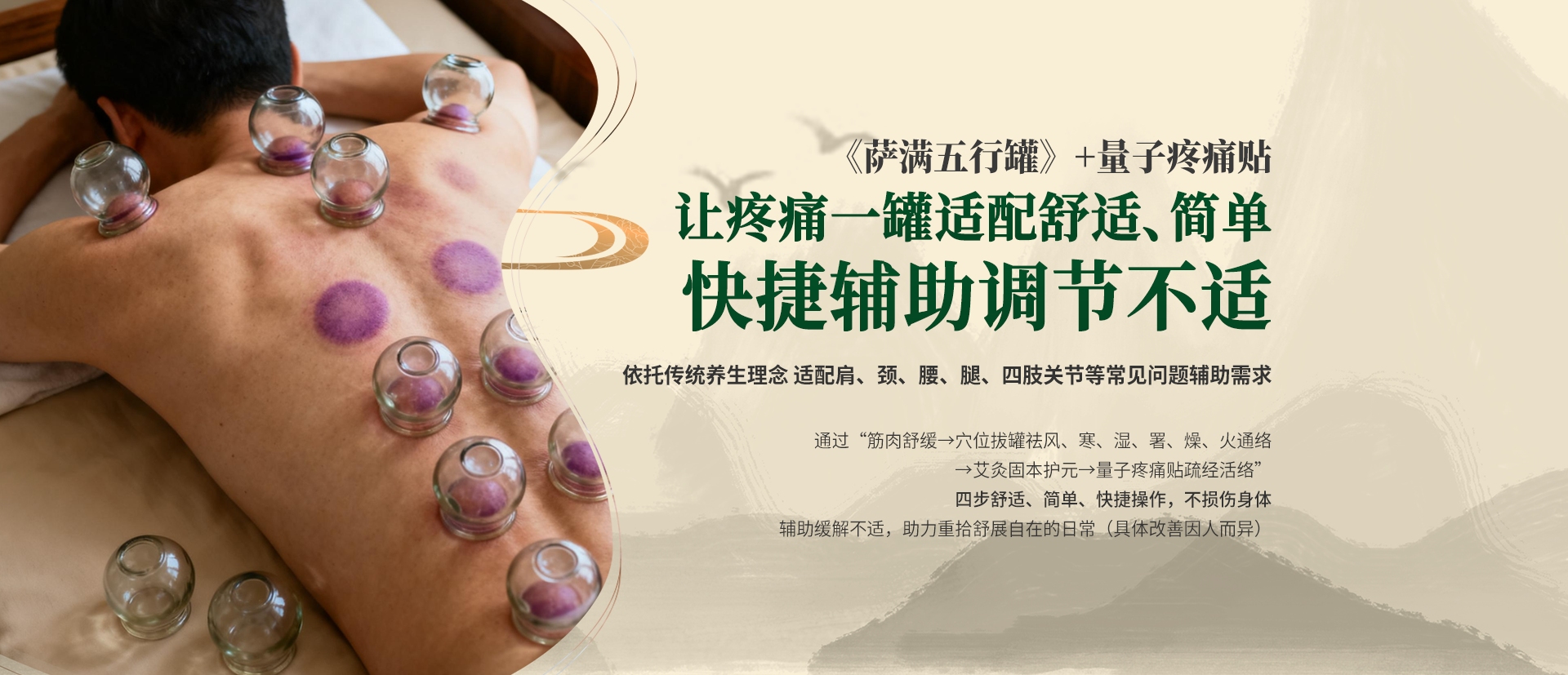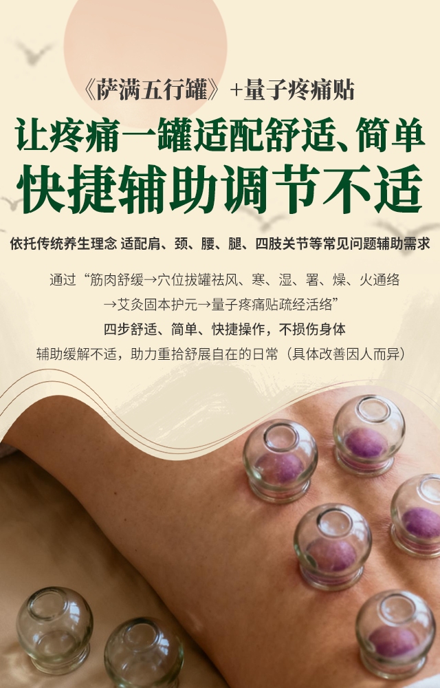 《萨满五行罐》:含五行磁石,通过高压负压作用于穴位,辅助通络、活血、散瘀,祛除风、寒、暑、湿、燥、火。